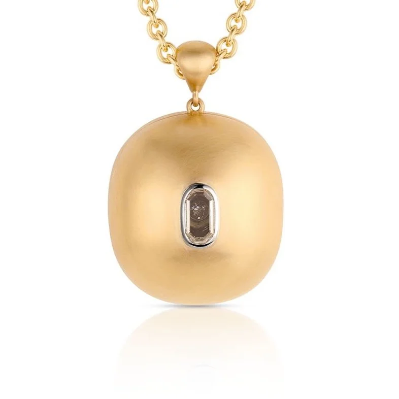 This lovely Tahitian pearl shifts from a lighter to a deeper pistachio green, top to bottom — a rare, one-of-a-kind find, just how I like them. Set in beautifully warm 22k Fairmined gold and hand crafted in California. Chain sold separately.